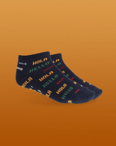 Ankle cut socks in navy blue color with the word "HELLO" in many languages and colors.