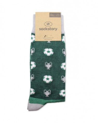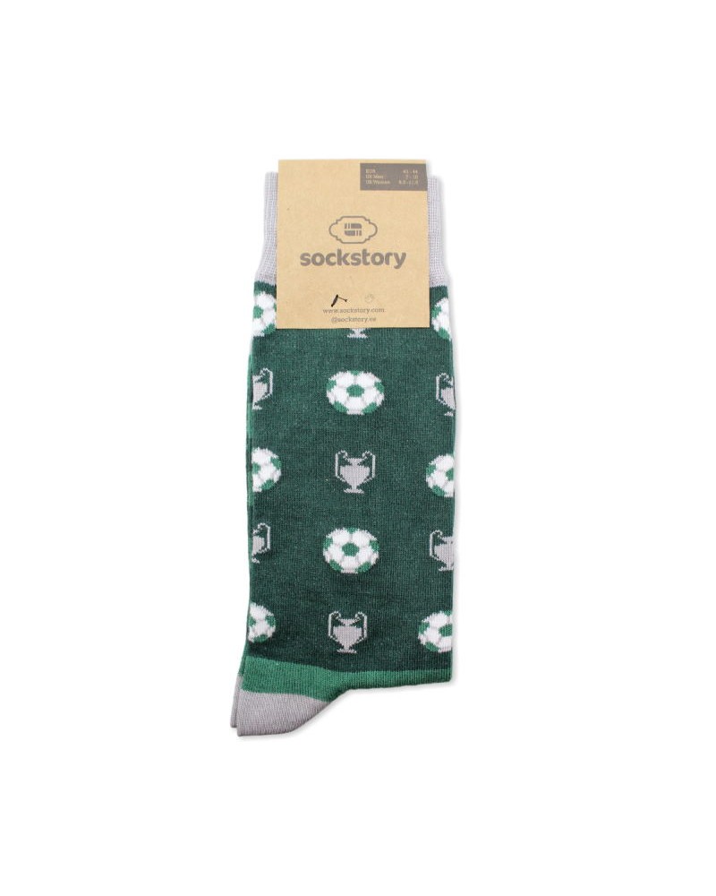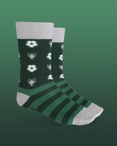 Mid calf socks in forest green color with balls and cups and green stripes on the foot part simulating the grass of a football field. Elastic details, heel and toe in grey.