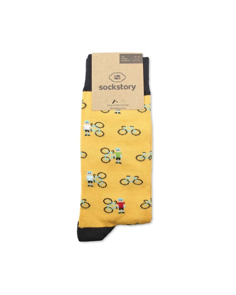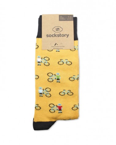 Mid calf socks in yellow with La Vuelta cyclists and bikes. Elastic details, heel and toe in black.