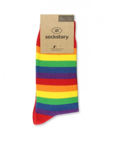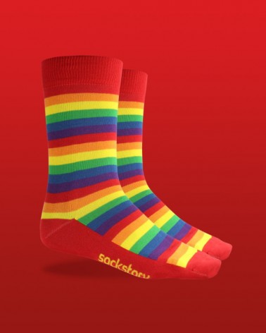 Mid calf socks with a rainbow design.