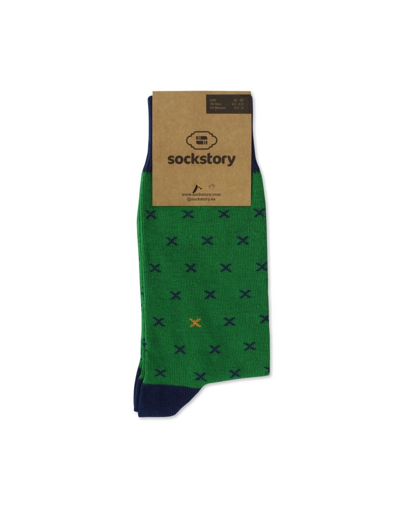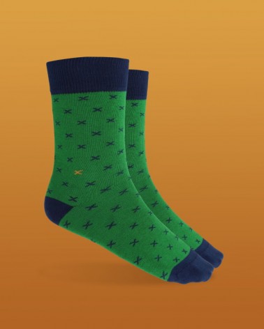 Forest green mid calf socks with navy blue crosses, one of which is orange at the ankle. Rubber details, heel and toe in navy blue.