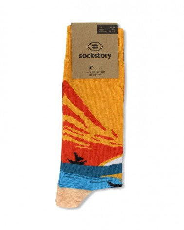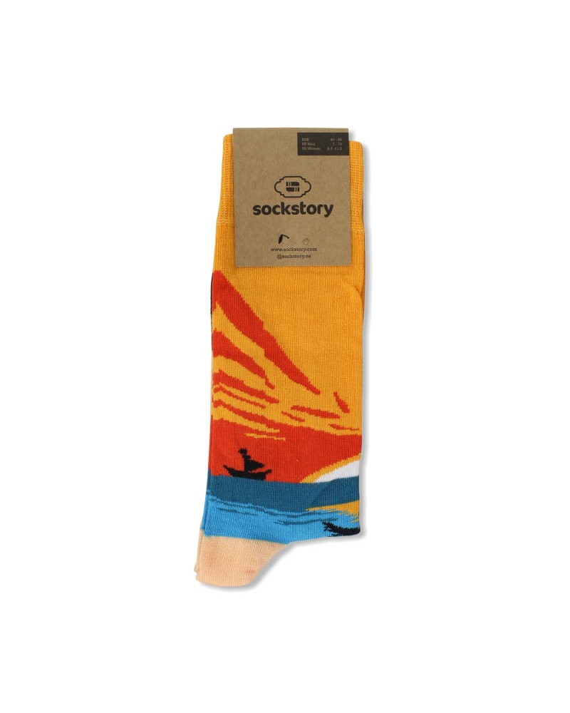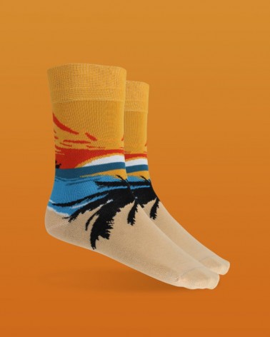 Mid calf socks with sunset landscape on the beach in the colors orange of the sky, blue of the sea, cream of the beach or details of palm tree and boat in black.