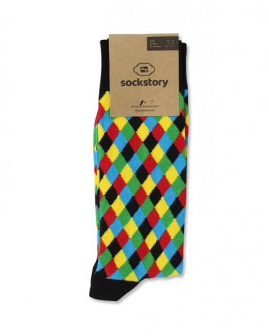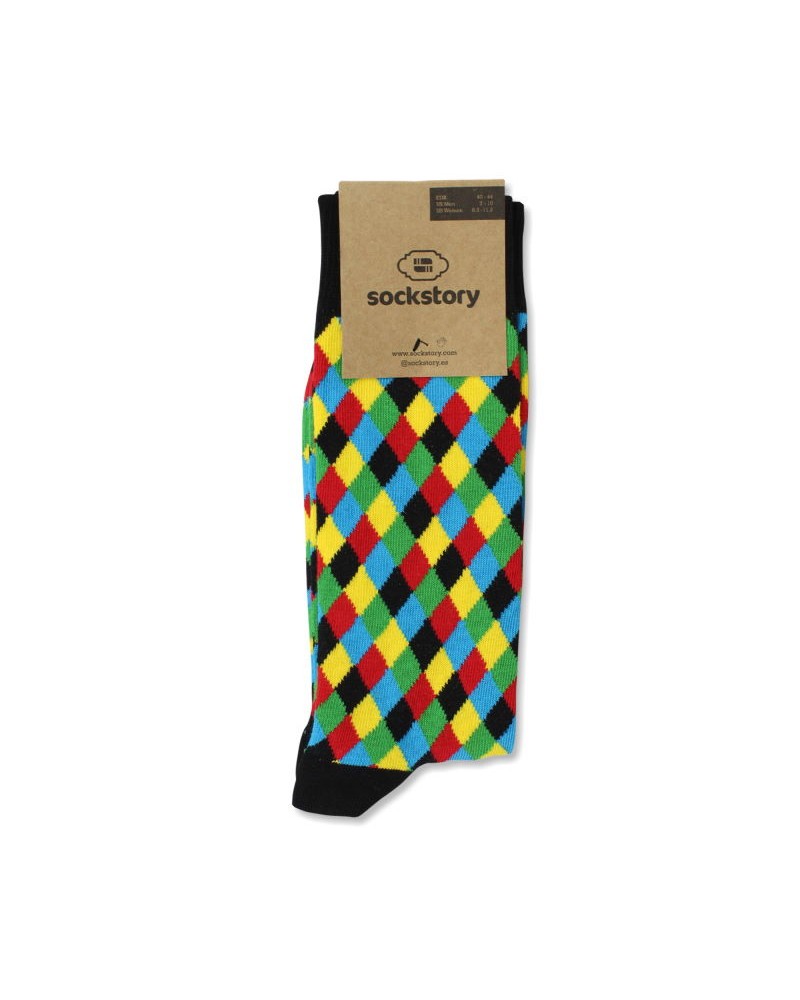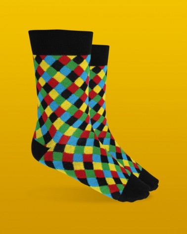 Mid calf socks with multicolored lozenges print. Elastic details, heel and toe in black color.