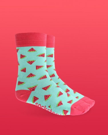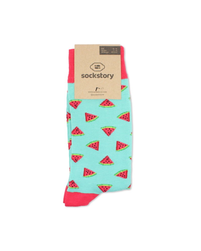 Mid calf blue color socks with watermelons print. Elastic details, heel and toe in red.