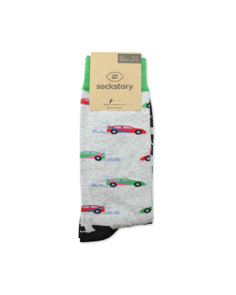 Mid calf grey color socks with drawings of racing cars. Elastic detail in green