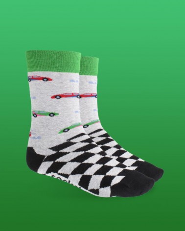 Mid calf grey color socks with drawings of racing cars and a large checkered flag on the foot. Elastic detail in green.