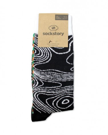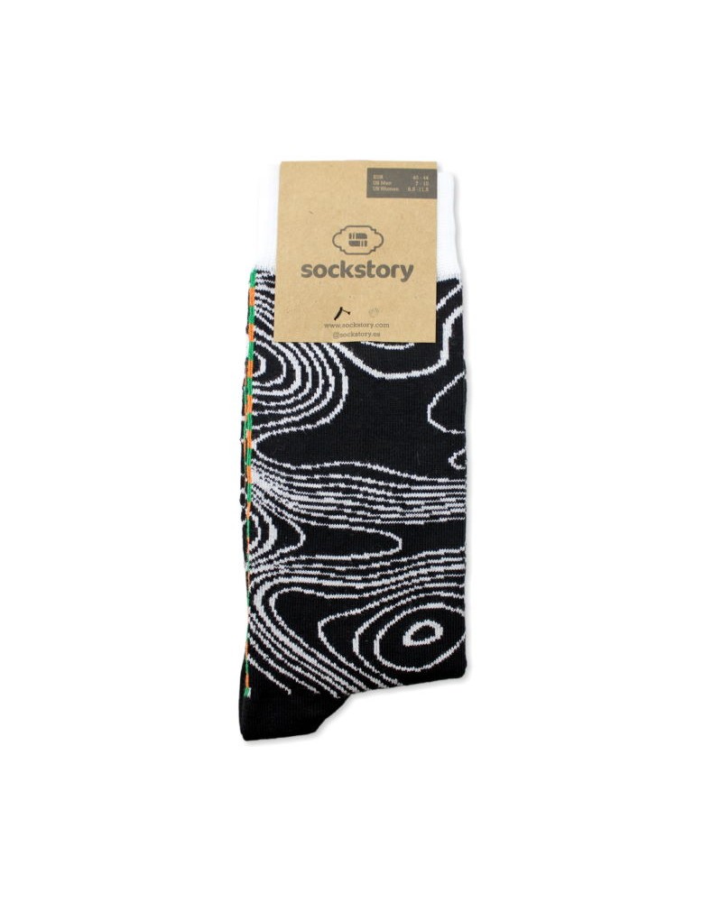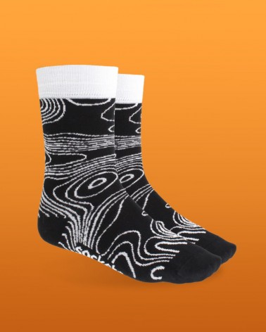 Calcetines de media caña color negro con el diseño de un mapa topográfico. Detalles de elástico en blanco, talón y puntera en negro.