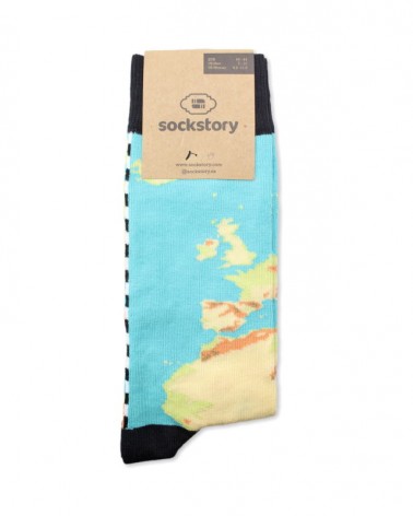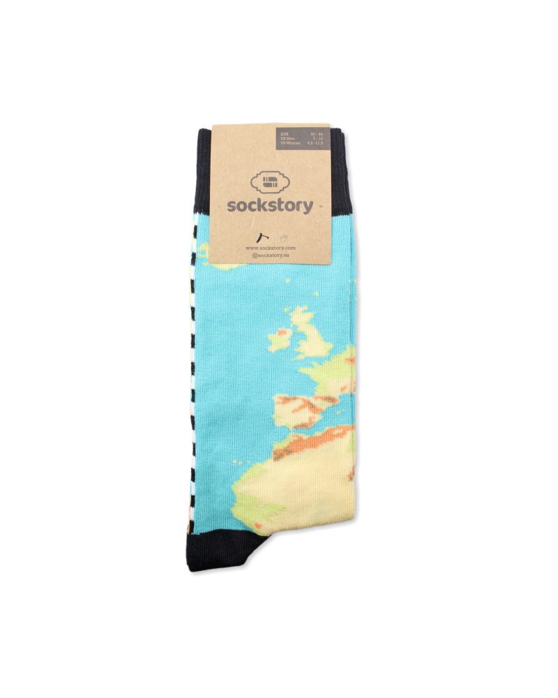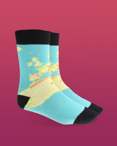 Calcetines de media caña color azul con el diseño de un mapa físico. Detalles de elástico, talón y puntera en negro