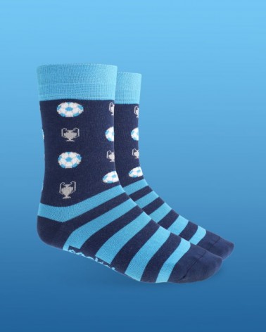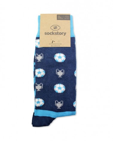 Calcetines de media caña color azul marino con balones y copas además de rayas azules en la parte del pie. Detalles de elástico, talón y puntera en azul eléctrico.