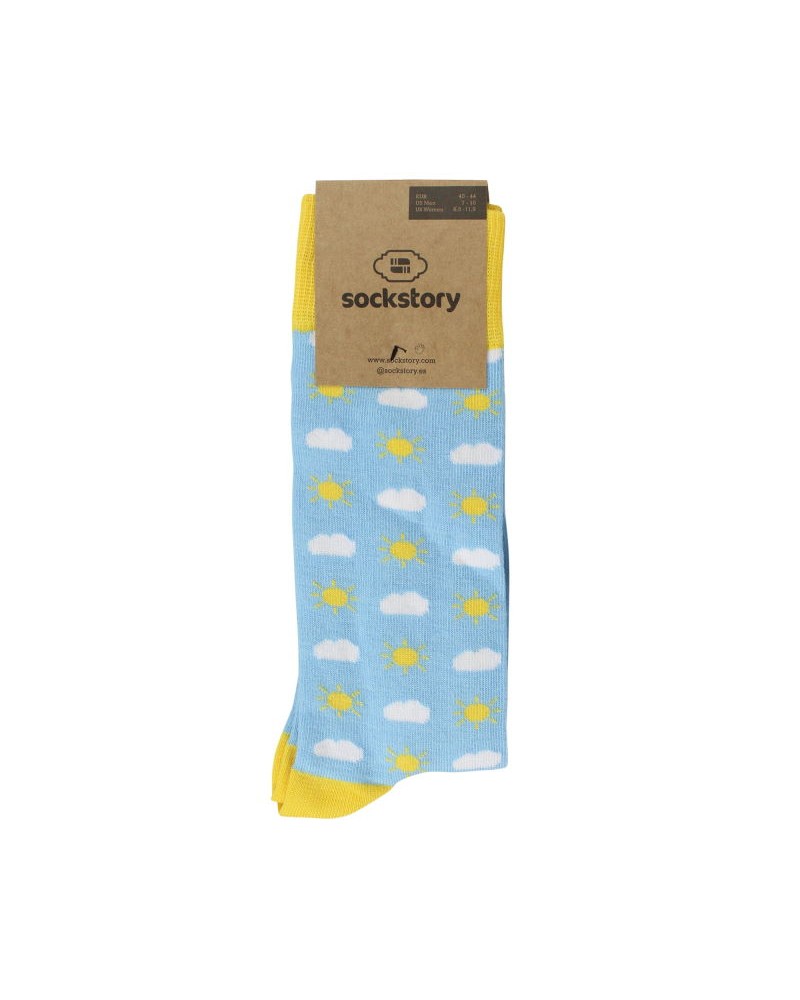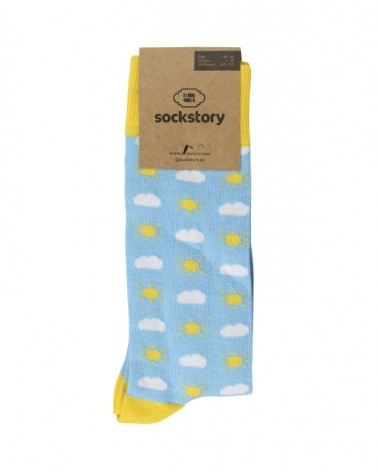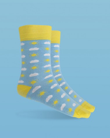 Calcetines de color azul celeste con diseño de soles y nubes. Detalles de elástico, talón y puntera en amarillo.