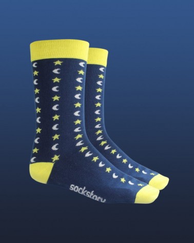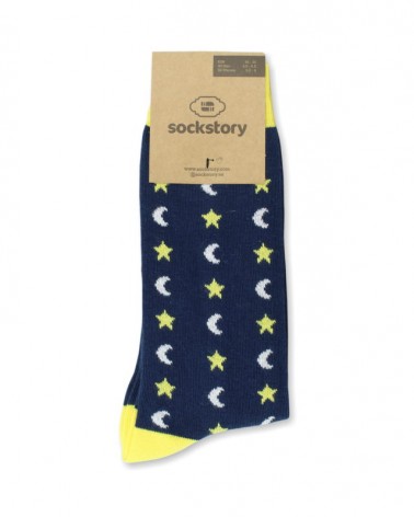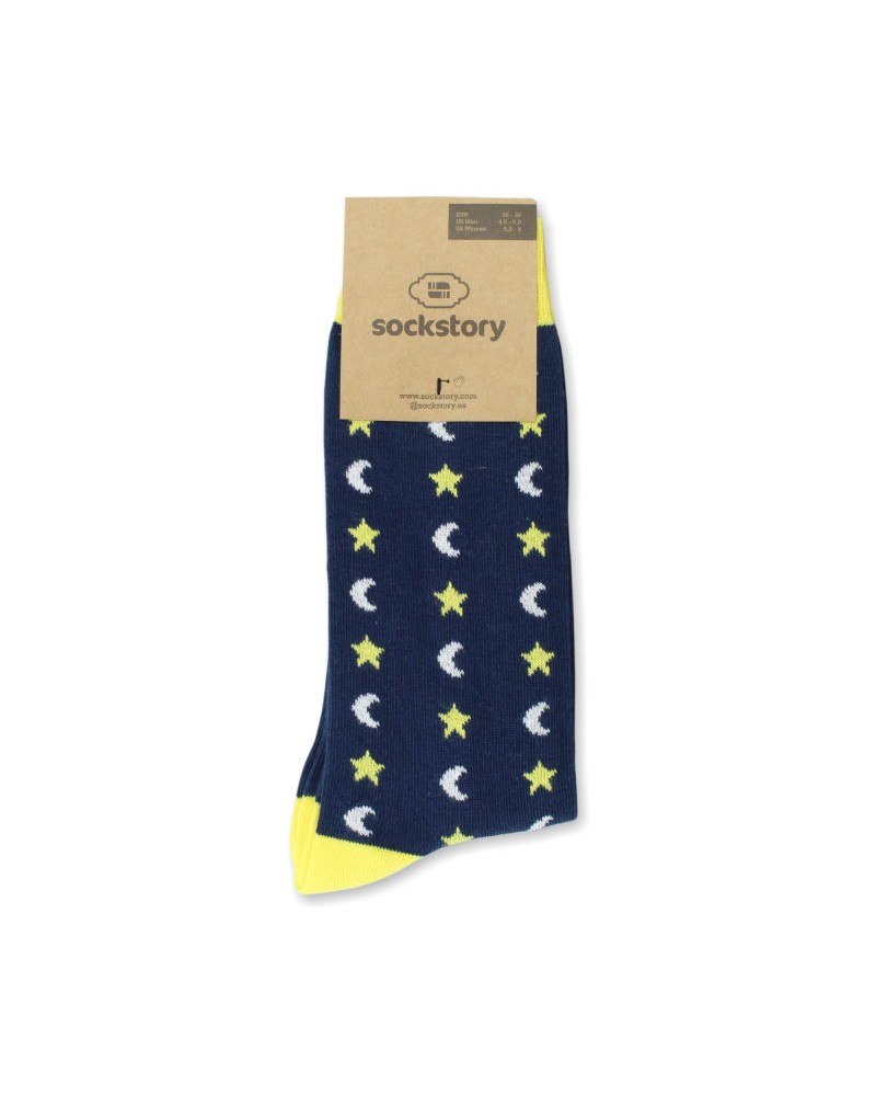 Calcetines Media Caña de color azul marino con diseño de lunas y estrellas. Detalles de elástico, talón y puntera en amarillo