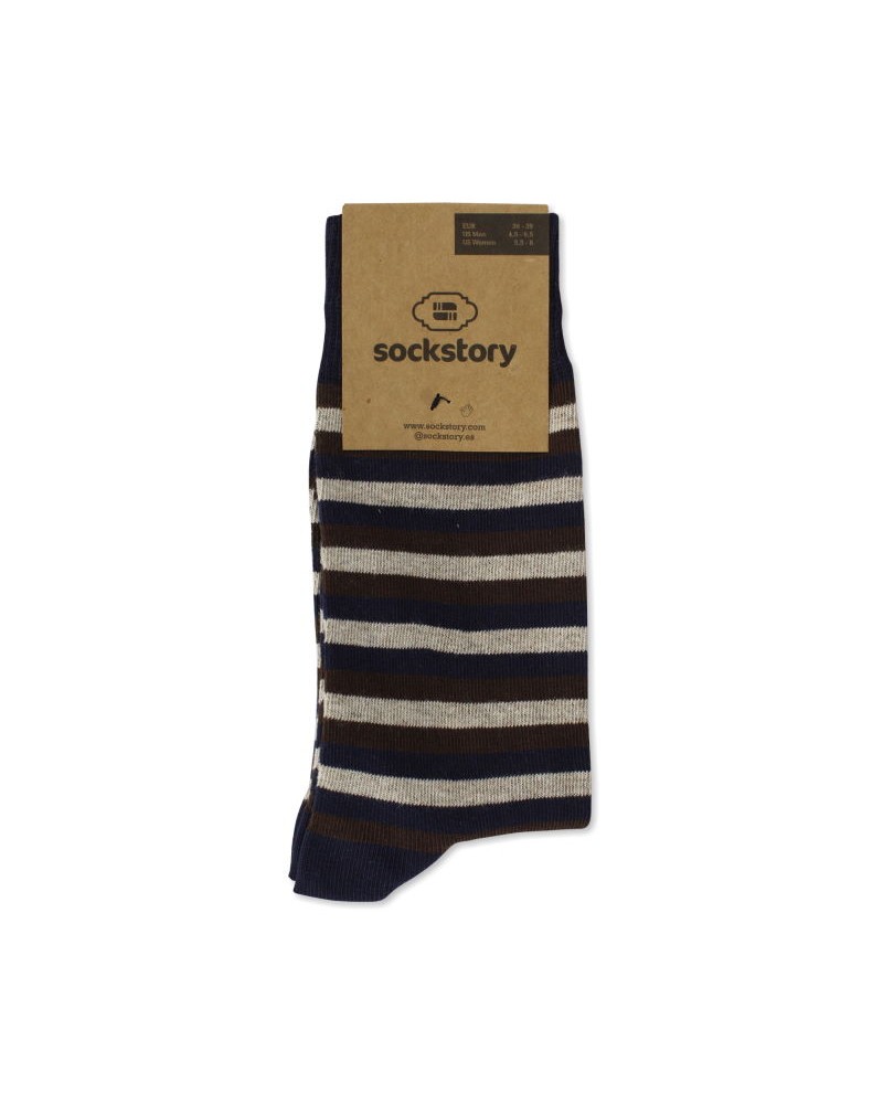 Calcetín media caña con rayas en colores azul marino, beige y marrón. Detalles de goma, talón y puntera en azul marino.