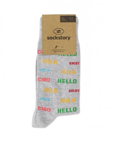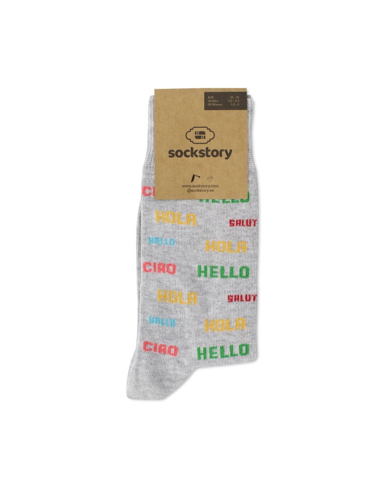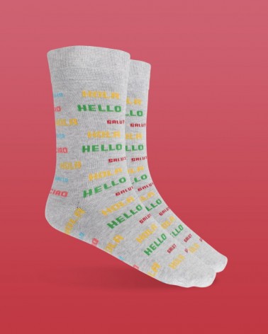 Calcetines de media caña en color gris con la palabra HOLA en varios idiomas y colores.