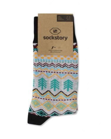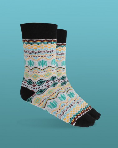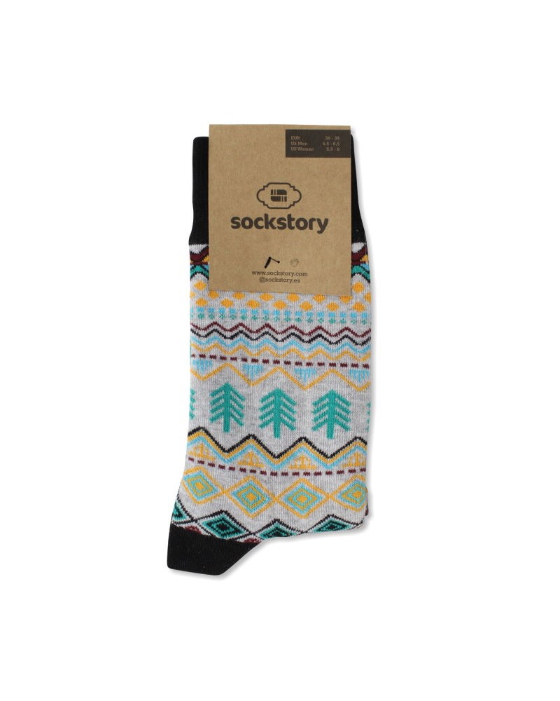 Calcetines de media caña en color gris con un patrón étnico con distintos colores. Detalles de goma, talón y puntera en color negro.
