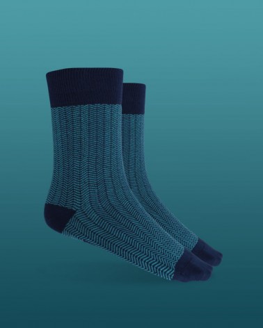 Calcetines de media caña con patrón estilo espiga en colores azul Bondi y azul Oxford. Detalles de goma, talón y puntera en color azul Oxford.