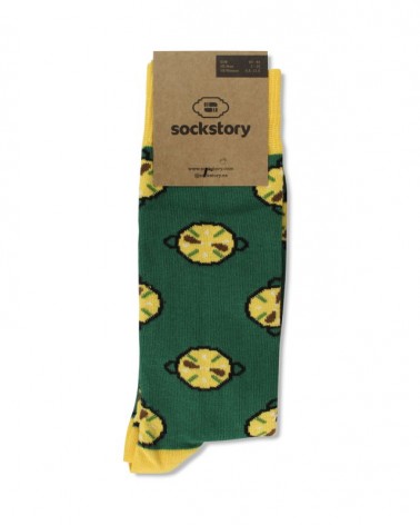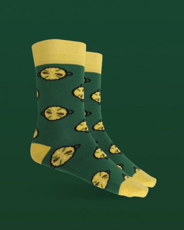 Calcetines de media caña verde con estampado de paellas. Detalles de la goma, talón y puntera en amarillo.