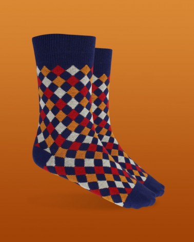 Calcetines de media caña con estampado de rombos multicolores. Detalles de goma, talón y puntera en azul Marino.